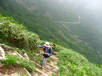 と、覗きこんだ激斜面の下から登って来る人の列 あぁ、砂防新道と合流だ