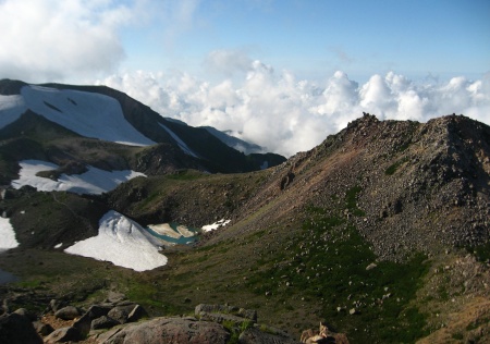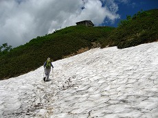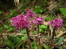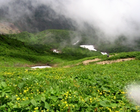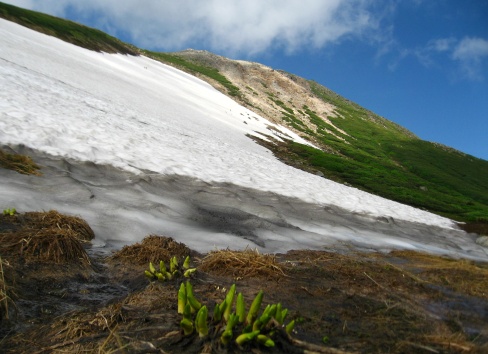 雪渓の残った辺りでは、ショウジョウバカマやコシジオウレンが、ひっそりと春を迎えておられ