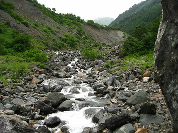 正面が蓮華温泉で、右手のガレ場が野天風呂だ、、と、
