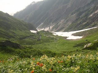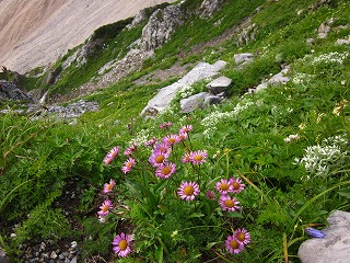 大雪渓への滑り落ちるような急斜面にも、高山植物が咲き乱れ、