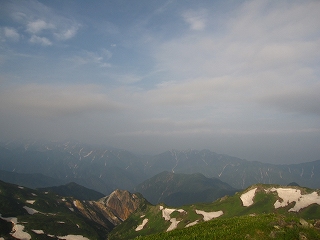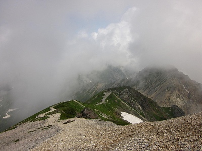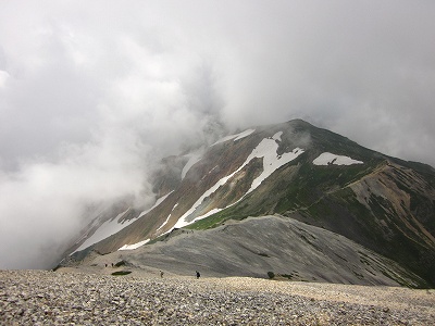 まだ7時半なのに、振り向くと白馬岳のすぐ手前までガスが迫って、あぁ、もう、隠れてしまうのかぁ、、