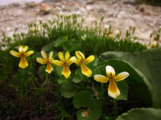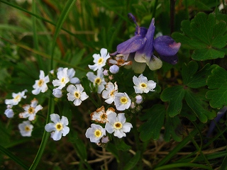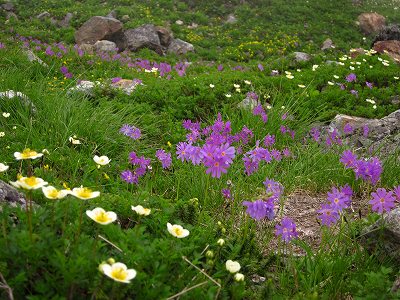 鑓ヶ岳に取りつくと、植生ががらりと変わりオダマキ、イワベンケイ、ムシトリスミレ、これ、ミヤマムラサキだっけ?