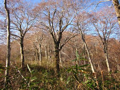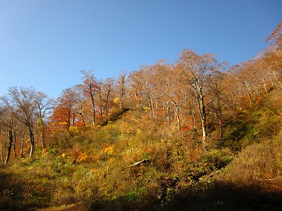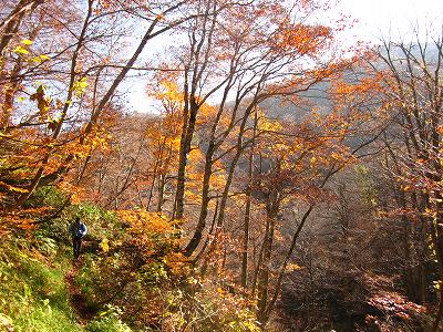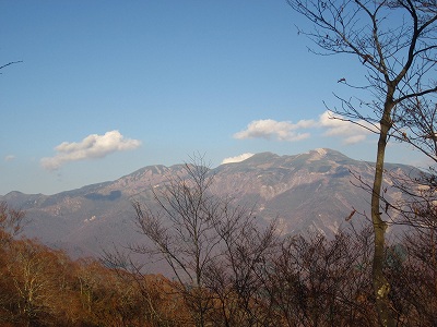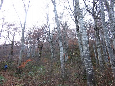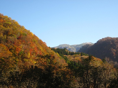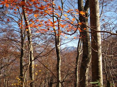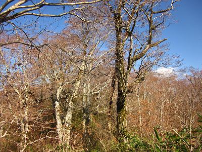やがて落葉樹林になると、木々の間から白山がよく見えて、