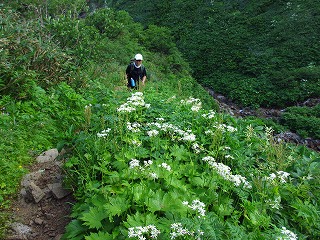 こんなにガレた斜面でも、ミヤマダイコンソウ、モミジカラマツなどが健気に咲いてる