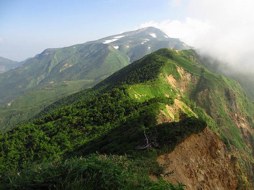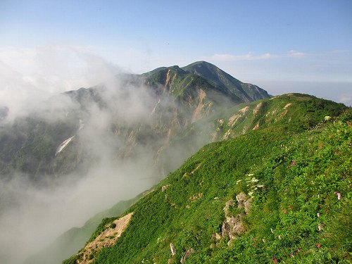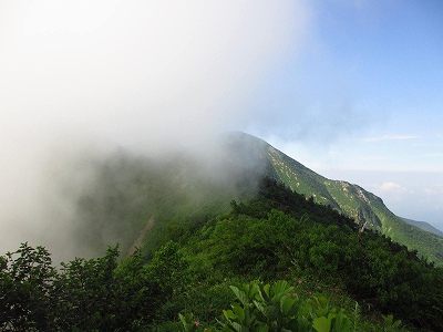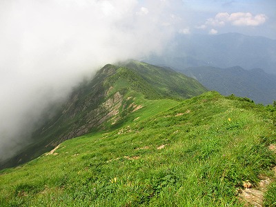 ガスまみれの三ノ峰の稜線が連なって見えてきた。