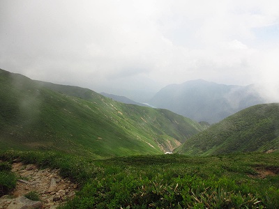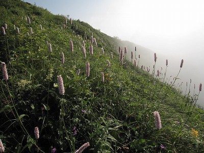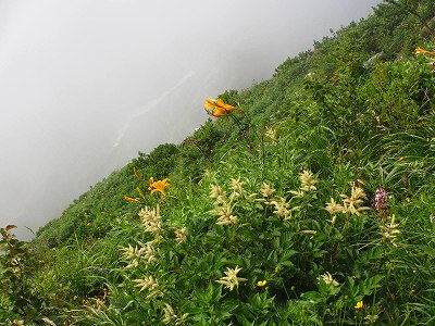 この辺でもう、戻ろうと、ガスの斜面を見下ろせば、やっぱりキスゲは疎らな様子。