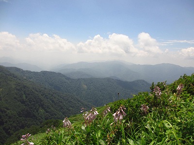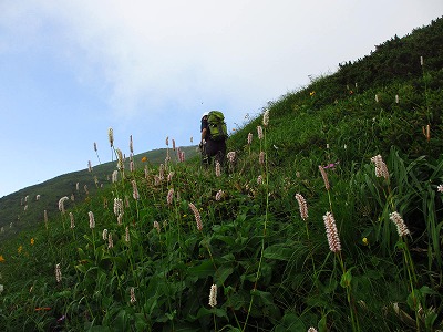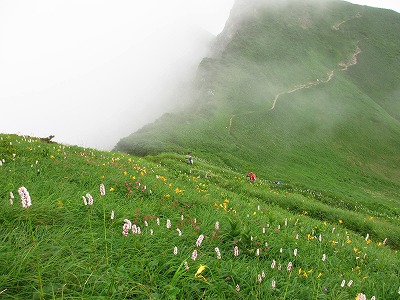 この斜面にもキスゲやイブキトラノオなど、花ビッシリで、登りの辛さがぶっ飛ぶぜ。(笑)