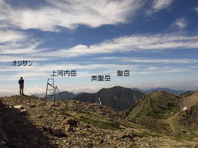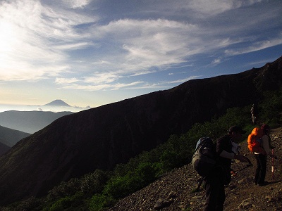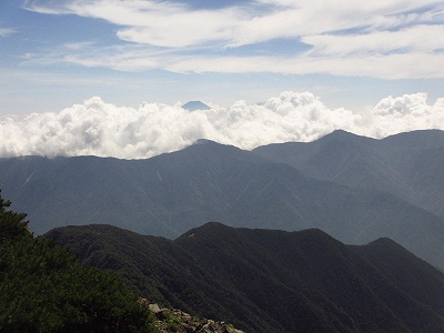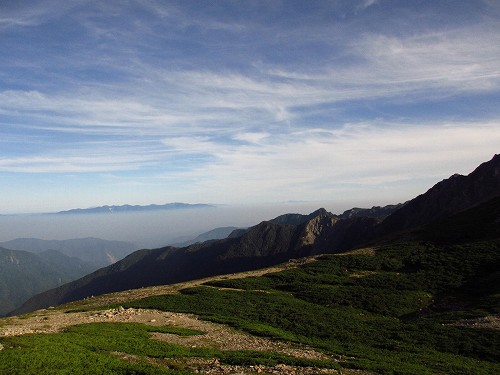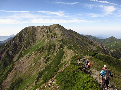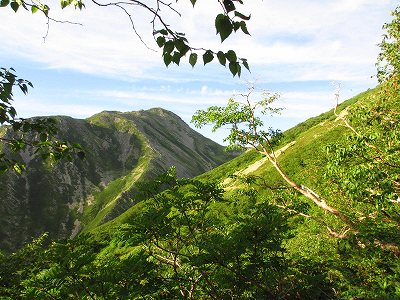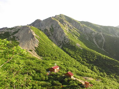 トラバース気味に高度を上げれば、みるみる小屋が下になり、昨日の荒川三山が、高々と聳えている。