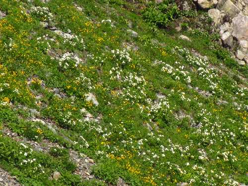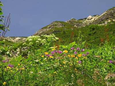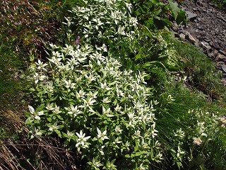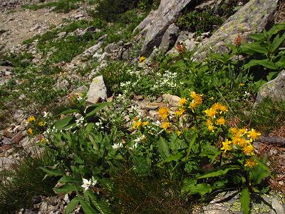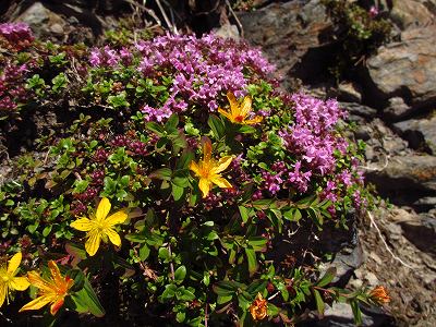 シナノオトギリ、イブキジャコウソウ、タカネツメクサ、ミネウスユキソウなどが、ガレ場にへばりつくように。